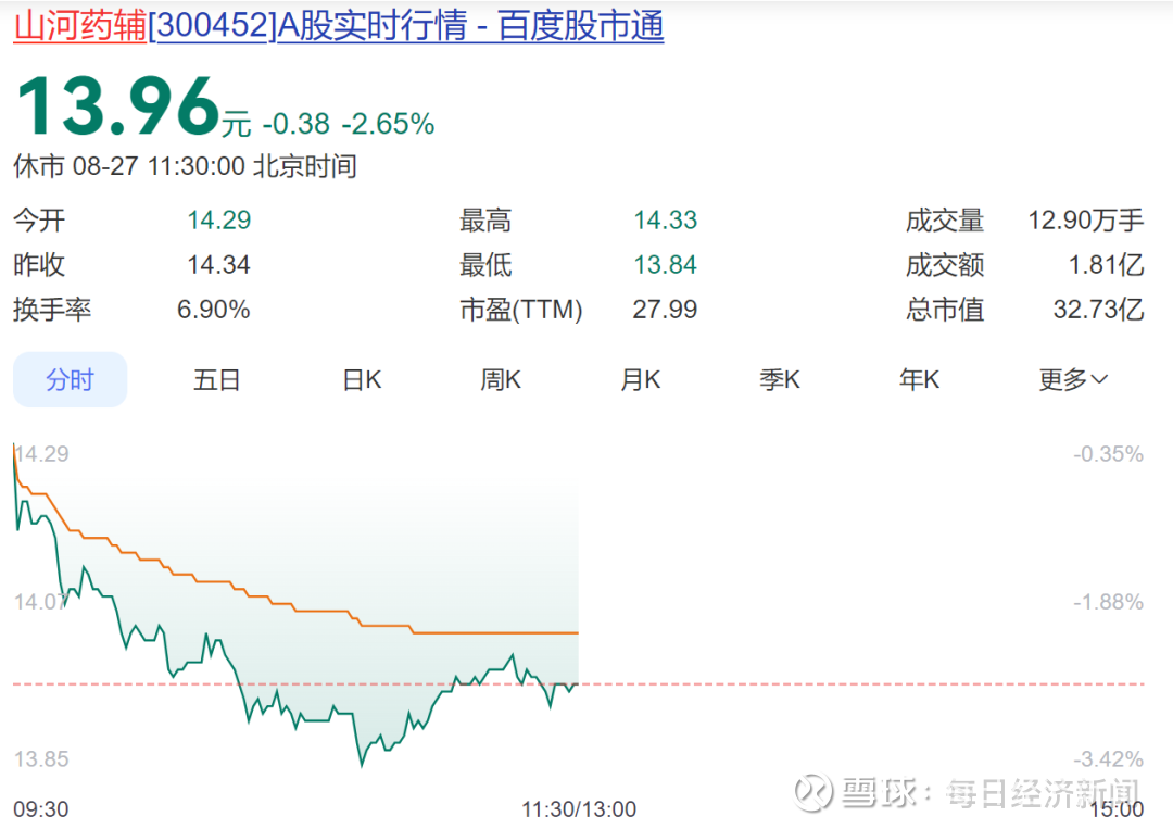 二级市场上,山河药辅27日开盘跳水,截止午盘收盘,报13.96元/股,下跌2.65%,最新市值32.73亿元。