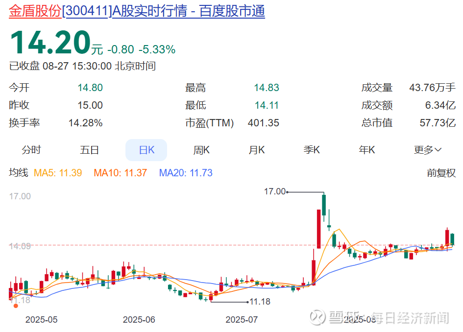 截至8月27日,金盾股份股价报收14.2元,近两个月内涨近15%,总市值57.73亿元。