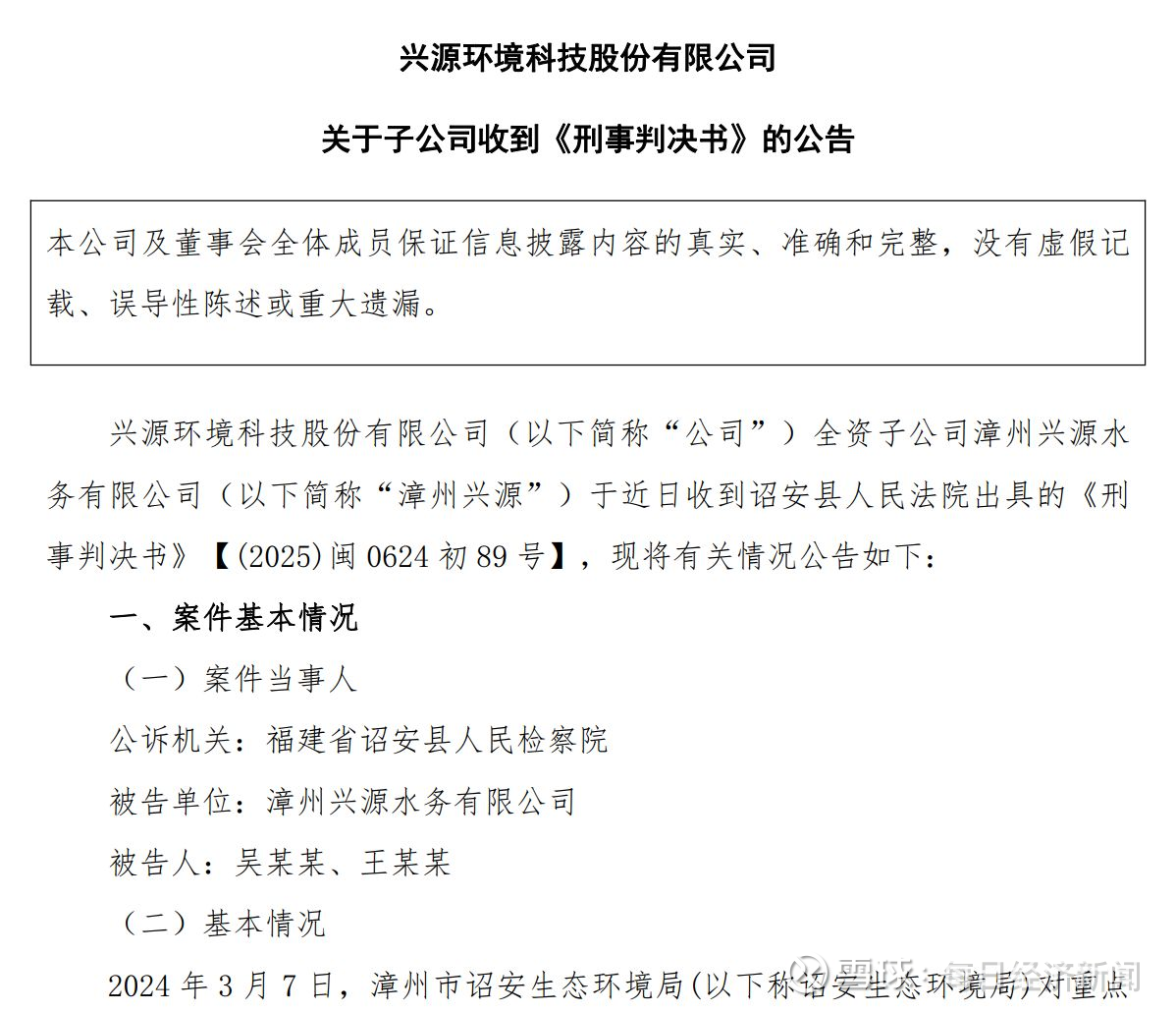 8月27日,兴源环境(300266.SZ,股价2.73元,市值42.42亿元)公告称,其全资子公司漳州兴源水务有限公司(以下简称“漳州兴源”)于近日收到诏安县人民法院出具的《刑事判决书》。