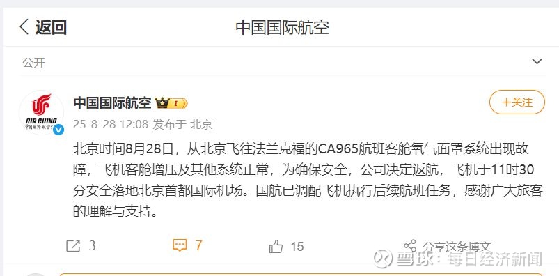 北京时间8月28日,从北京飞往法兰克福的CA965航班客舱氧气面罩系统出现故障,飞机客舱增压及其他系统正常,为确保安全,公司决定返航,飞机于11时30分安全落地北京首都国际机场。国航已调配飞机执行后续航班任务,感谢广大旅客的理解与支持。