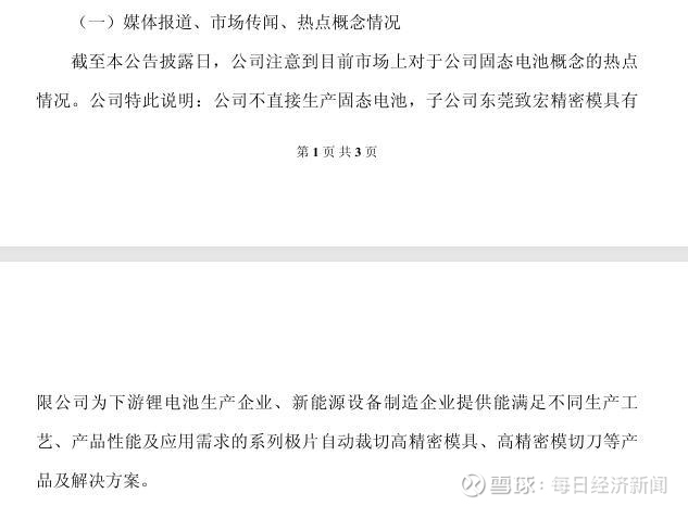 因注意到目前市场上的情况,德新科技特此说明:公司不直接生产固态电池。据介绍,其子公司东莞致宏精密模具有限公司为下游锂电池生产企业、新能源设备制造企业提供一系列极片自动裁切高精密模具、高精密模切刀等产品及解决方案。