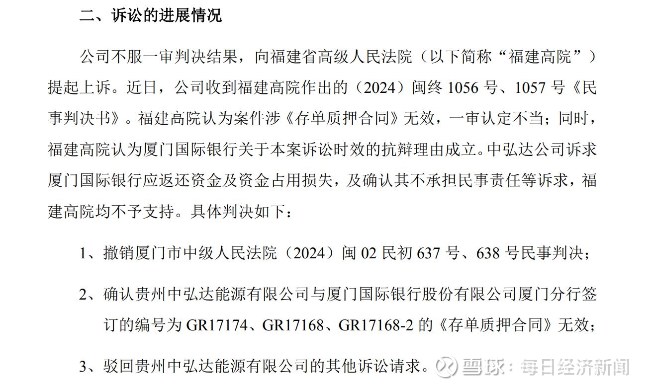 2024年6月,中弘达公司又以原告身份,以《存单质押合同》不发生法律效力或无效为由起诉厦门国际银行,要求后者返还资金。