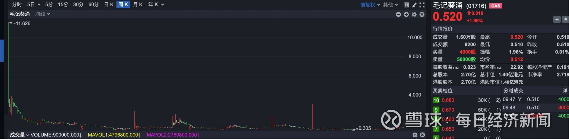毛记葵涌(2018 年上市)上市即巅峰,如今已沦为“仙股”。2018年3月,毛记葵涌上市首日股价最高暴涨超20倍,最高报11.62港元。但随后快速回落,截至2025年9月5日,毛记葵涌股价仅约0.5港元,总市值约1.4亿港元。