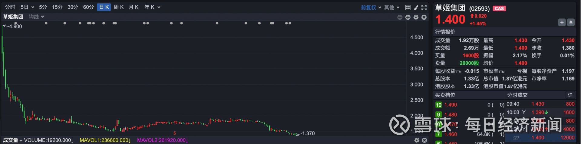 2024年底上市的草姬集团(02593.HK),命运和毛记葵涌比较类似。上市首日最高报4.9港元,但不久之后跌破3.75港元的发行价,当前股价约1.4港元,总市值约1.87亿港元。