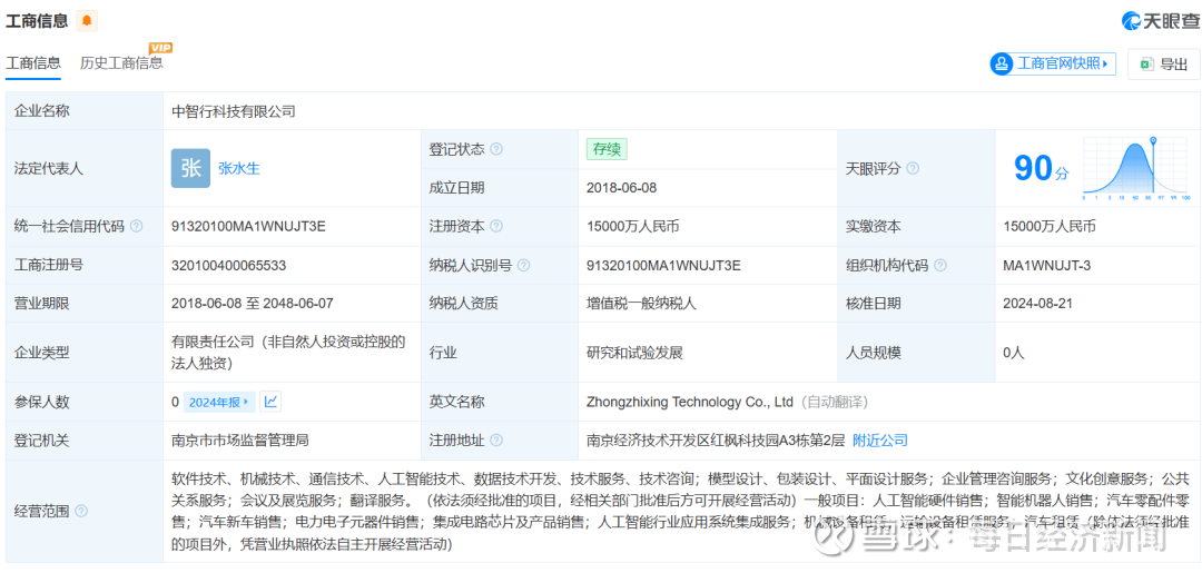 天眼查显示,中智行实缴注册资本达1.5亿元,王劲任公司董事长。