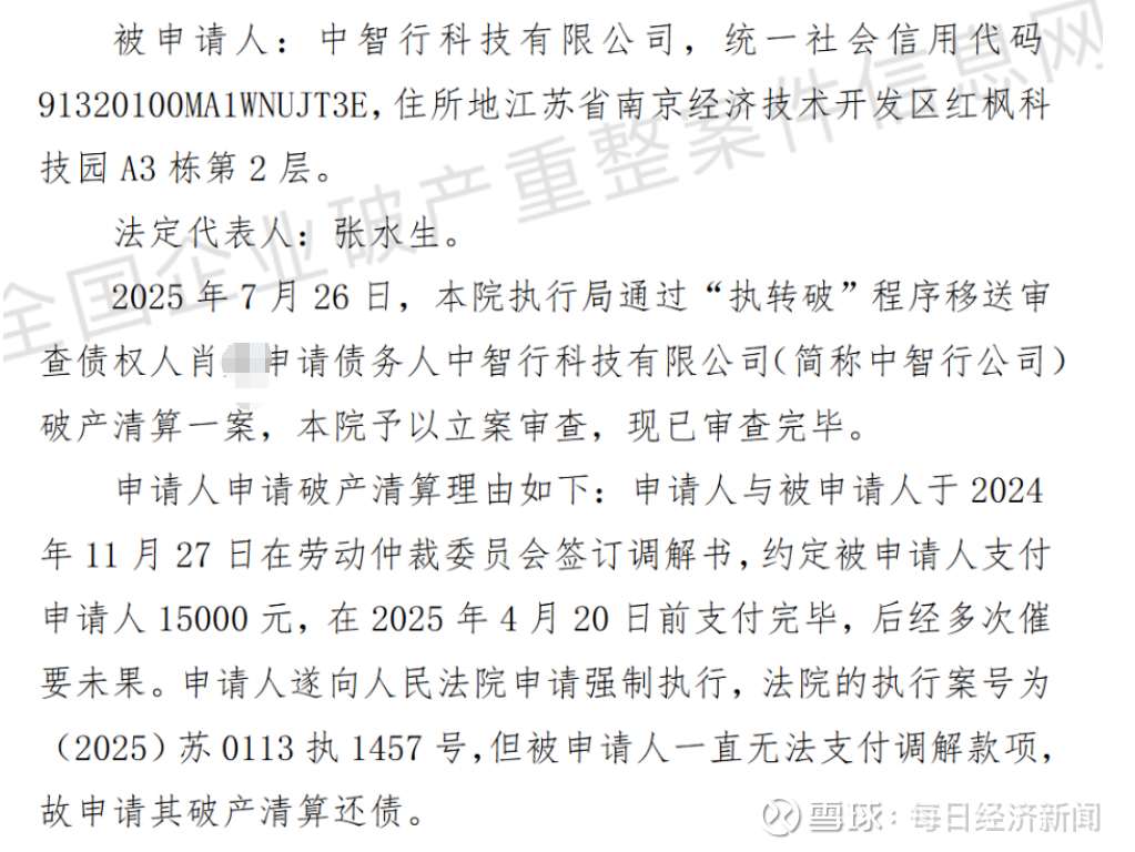 日前,江苏省南京市栖霞区人民法院裁定受理对中智行的破产清算申请。