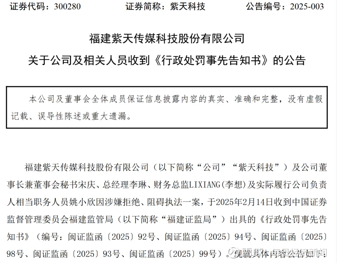同时,根据今年6月27日中国证监会对紫天科技下发的《行政处罚事先告知书》,紫天科技2022年、2023年年度报告存在虚假记载,2022年、2023年虚假记载的营业收入金额合计近25亿元,且占该两年披露的年度营业收入合计金额的63.53%。