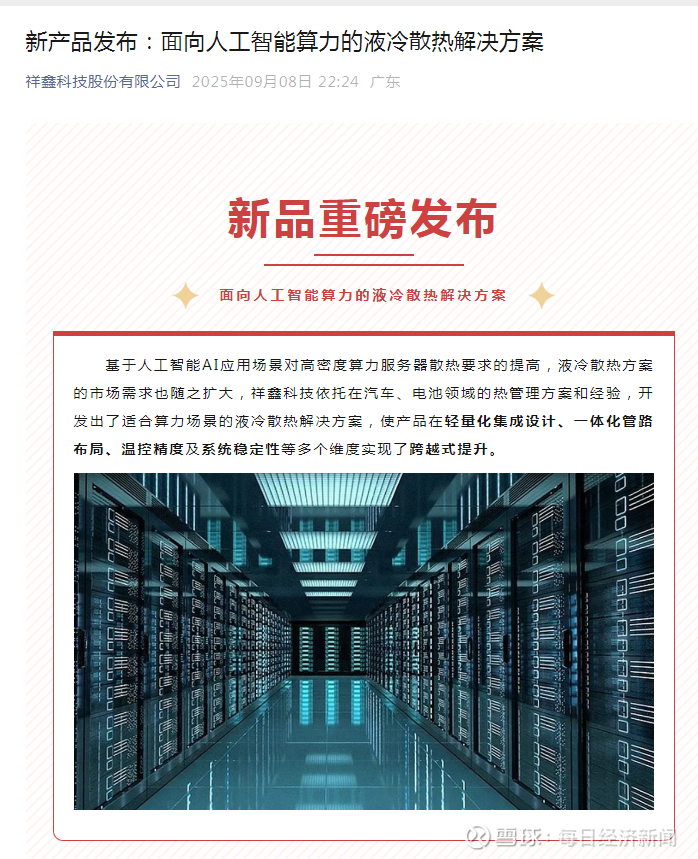 每经AI快讯,近日,基于人工智能AI应用场景对高密度算力服务器散热要求的提高,液冷散热方案的市场需求也随之扩大,祥鑫科技依托在汽车、电池领域的热管理方案和经验,开发出了适合算力场景的液冷散热解决方案,使产品在轻量化集成设计、一体化管路布局、温控精度及系统稳定性等多个维度实现了跨越式提升。