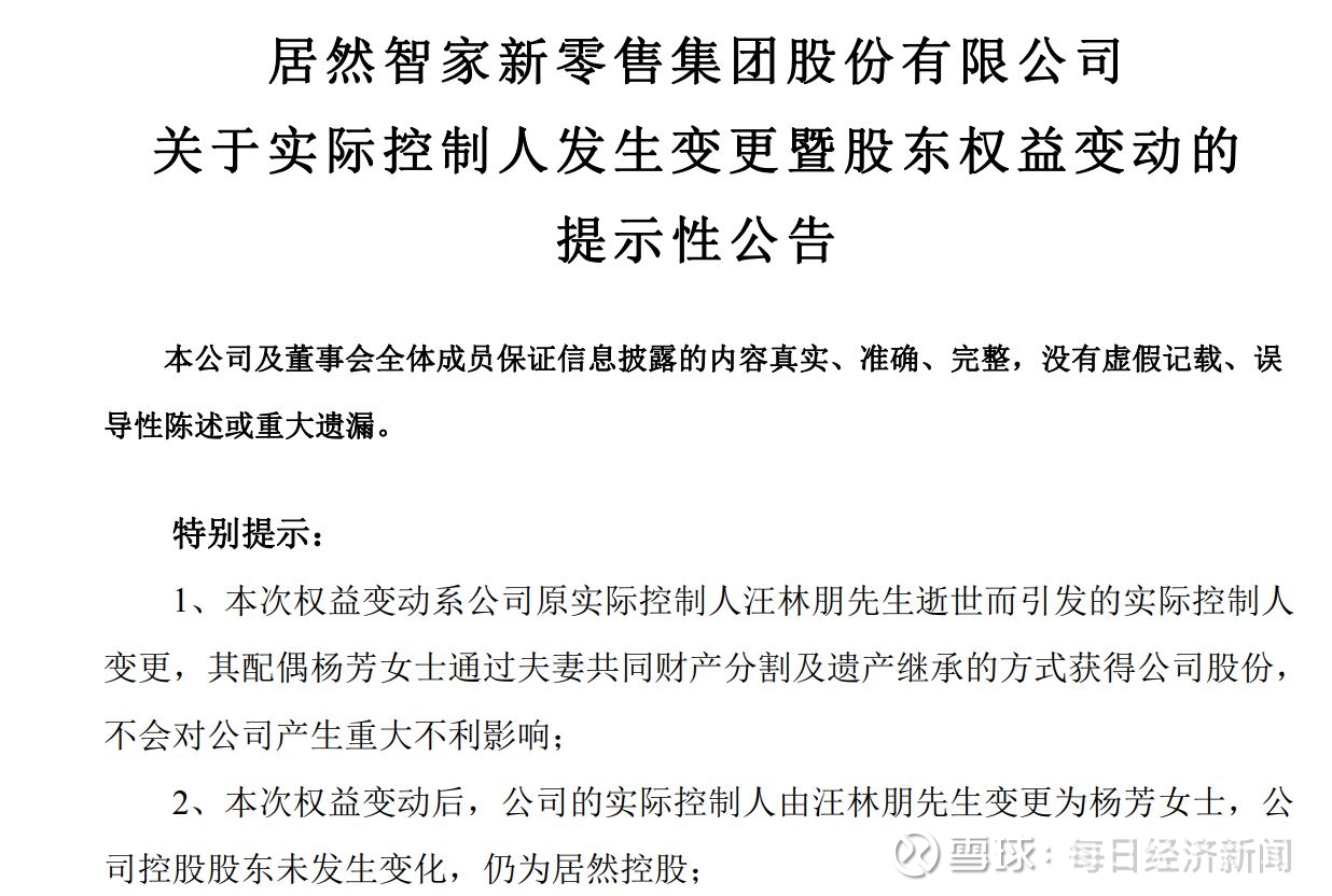 根据公告,杨芳通过夫妻共同财产分割和遗产继承的方式依法取得汪林朋直接持有的居然智家股份,通过居然控股、慧鑫达建材间接控制的居然智家股份,导致收购人直接及间接拥有的居然智家权益发生变动。