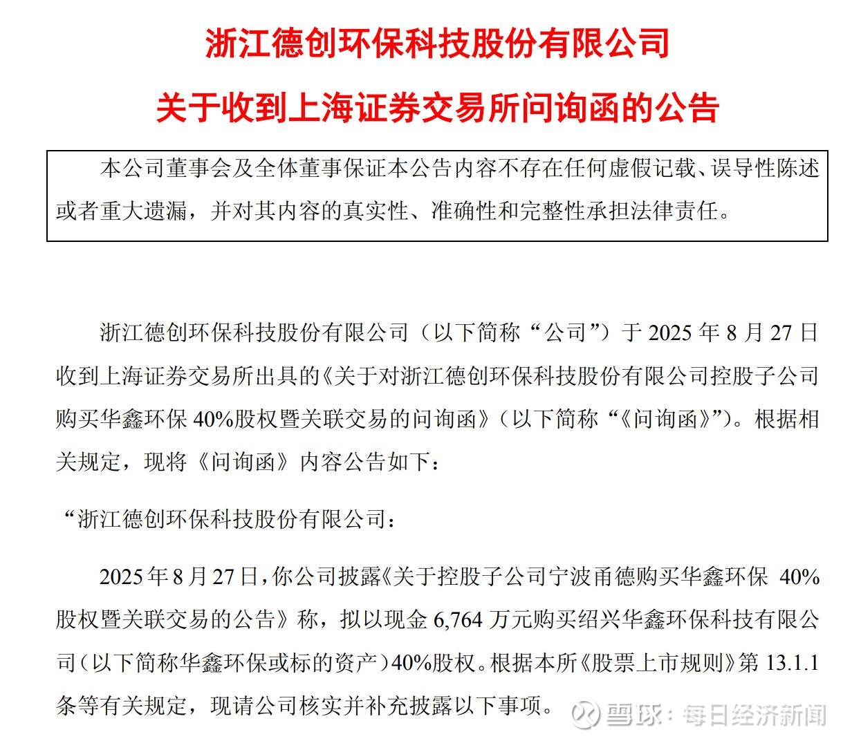 次日(8月27日),上交所向德创环保下发问询函,要求德创环保针对交易背景与关联关系、资产质量及交易必要性、货币资金及支付安排等问题予以回应。