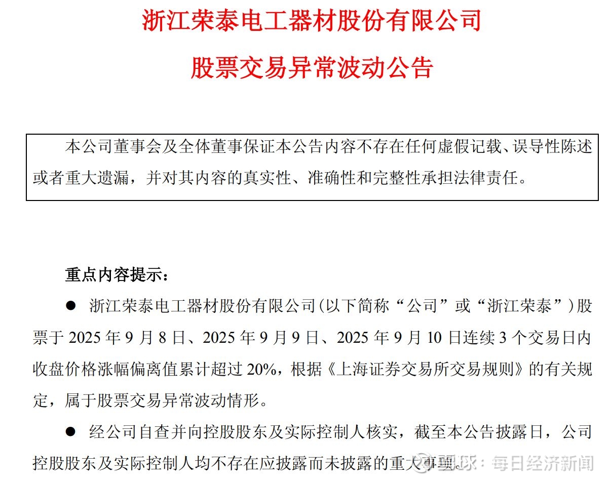 就在9月10日晚间,浙江荣泰公告称,9月8日至10日,公司股票连续3个交易日内收盘价格涨幅偏离值累计超过20%,属于股票交易异常波动情形。截至本公告披露日,公司控股股东及实际控制人均不存在应披露而未披露的重大事项。