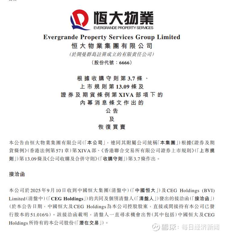 9月11日晚,恒大物业(06666.HK)公告,公司于2025年9月10日收到中国恒大集团及CEGHoldingsLimited的共同及个别清盘人发出的接洽函。