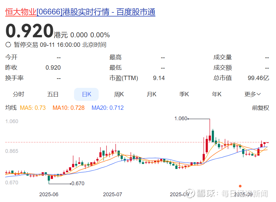 9月11日上午,恒大物业宣布停牌。停牌前,恒大物业股价不足1港元,总市值99.46亿港元(约合人民币91亿元)。