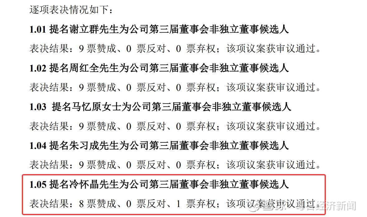 公告显示,在非独立董事候选人的提名表决中,谢立群、周红全、马忆原和朱习成均获9票赞成,全票通过;而冷怀晶的提名结果为8票赞成、1票弃权。