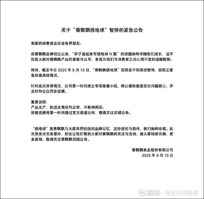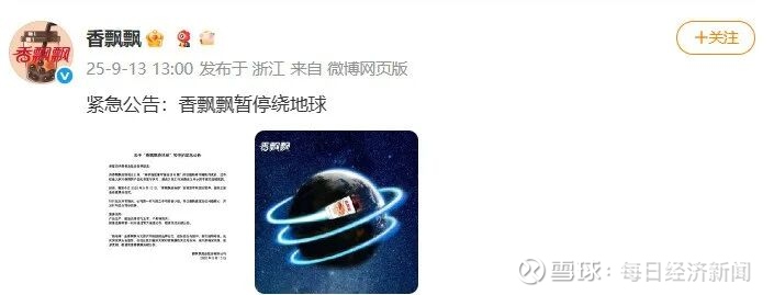 9月13日,香飘飘发文:“紧急公告:香飘飘暂停绕地球。”