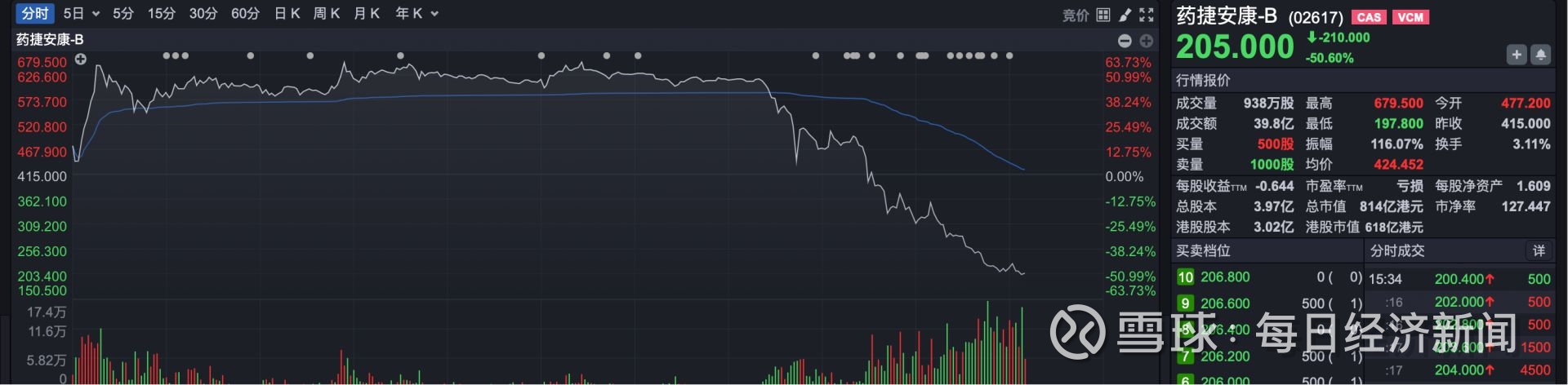 此后,抛盘进一步涌出,药捷安康-B股价毫无止跌迹象。15时37分,药捷安康-B股价跌破200港元,15时40分跌破190港元,最低跌至185港元。