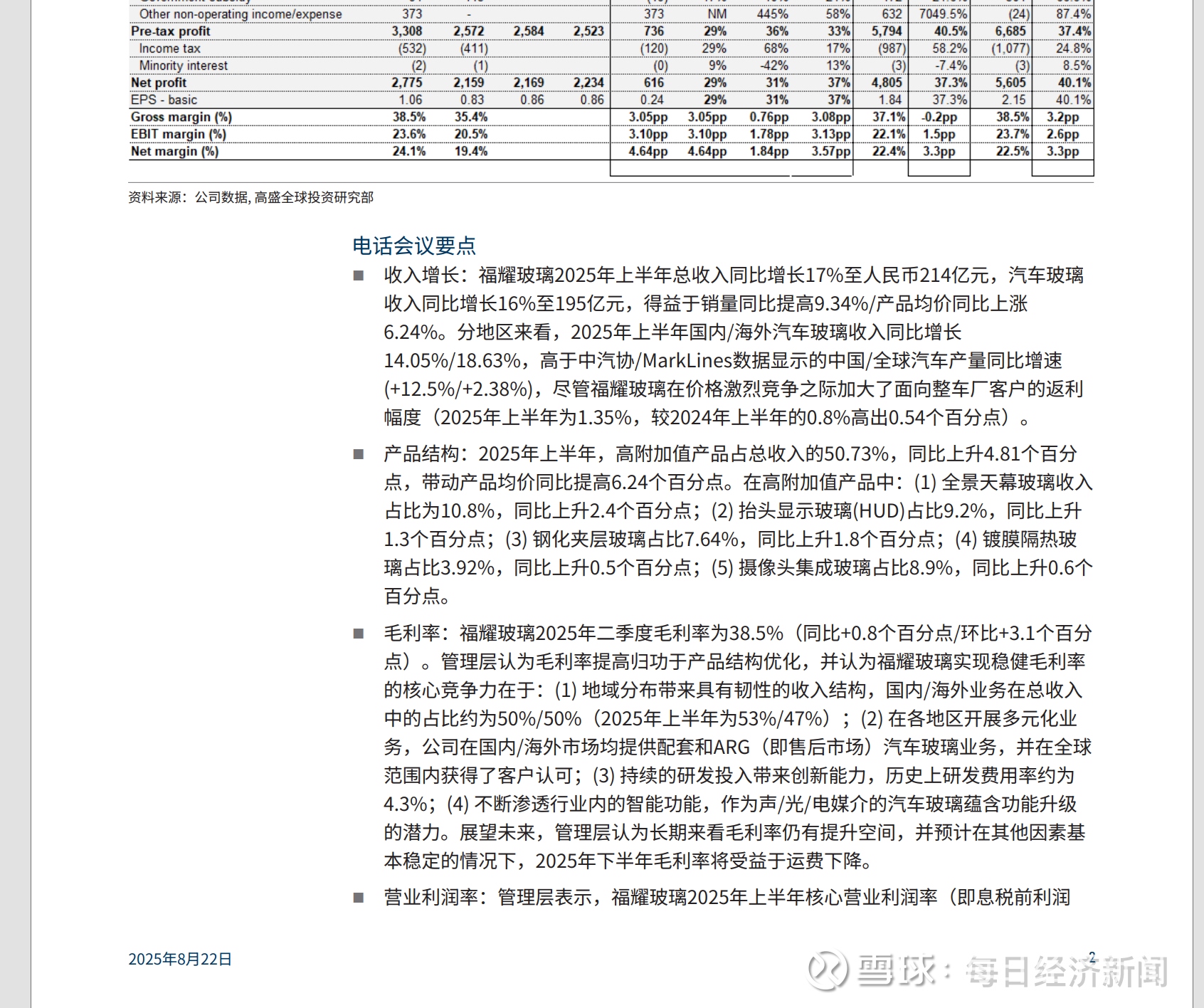 另一方面,高盛认为,福耀玻璃产品结构优化效果显著,带动毛利率大幅提升。二季度公司毛利率达38.5%,高于高盛预测的35.4%,主要得益于高附加值产品销售占比的快速提升。