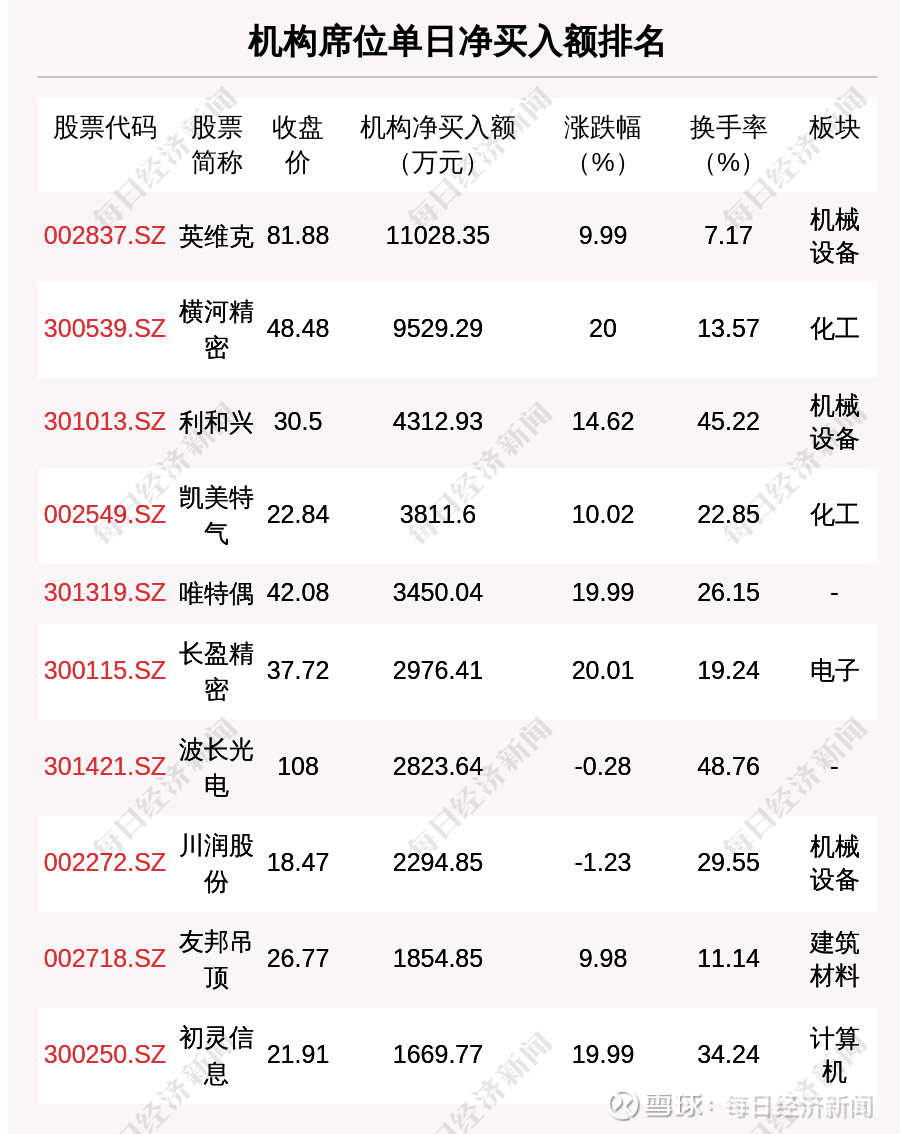 在龙虎榜中,涉及机构专用席位的个股有24只,净买入额前三的是英维克、横河精密、利和兴,分别为1.1亿元、9529.29万元、4312.93万元。