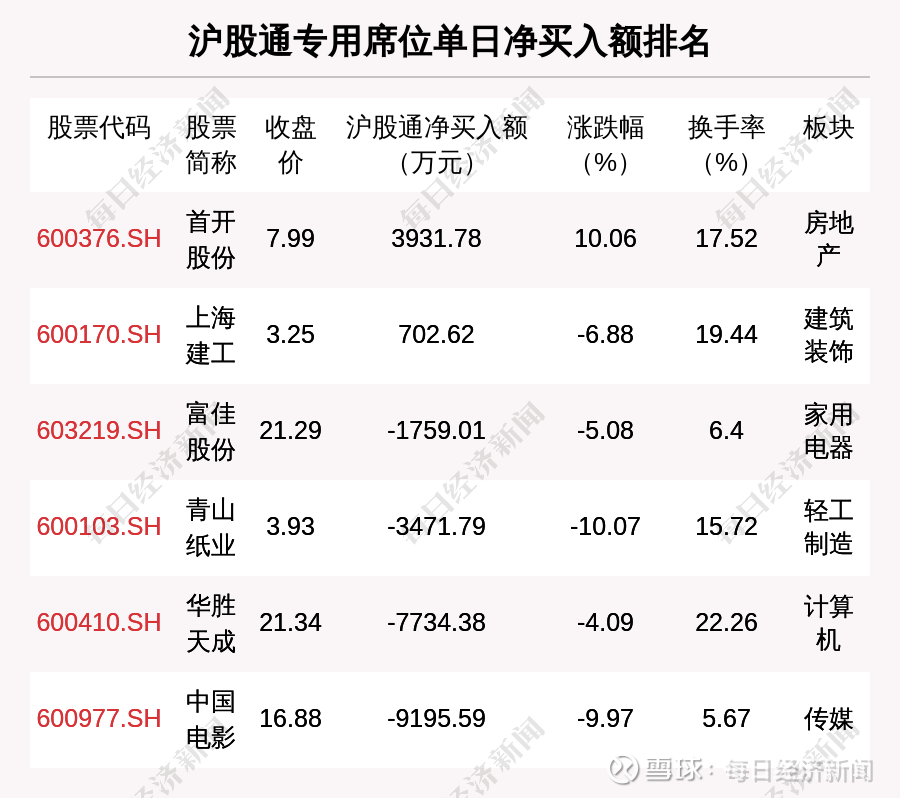 在龙虎榜中,涉及沪股通专用席位的个股有6只,首开股份的沪股通专用席位净买入额最大,净买入3931.78万元。