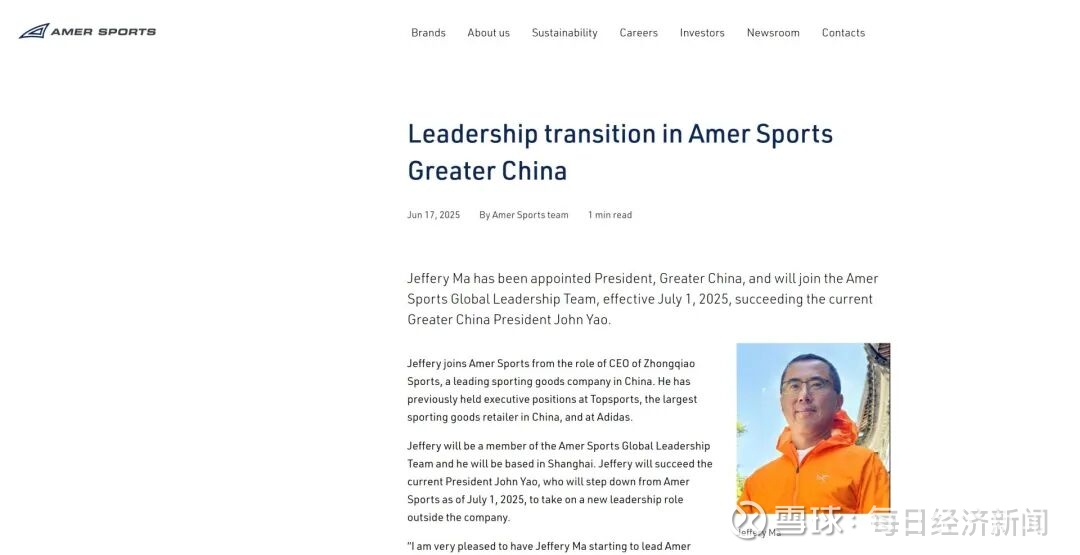 据亚玛芬体育(始祖鸟母公司)官网,今年6月的一份新闻稿显示,Jeffery Ma(马磊)被任命为大中华区总裁,并于2025年7月1日起加入Amer Sports(亚玛芬体育)全球领导团队,接替现任大中华区总裁姚剑。