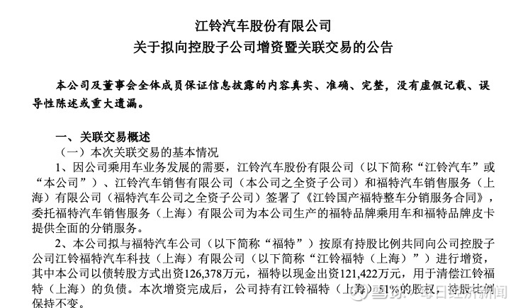 在外界看来,此次营销渠道的转变,是江铃汽车在乘用车领域发力的重要信号。9月23日晚间,江铃汽车还发布公告宣布,拟与福特汽车公司按原有持股比例共同向公司控股子公司江铃福特汽车科技(上海)有限公司进行增资,其中本公司以债转股方式出资约12.64亿元,福特以现金出资约12.14亿元,用于清偿江铃福特汽车科技(上海)有限公司的负债。本次增资完成后,江铃汽车持有江铃福特汽车科技(上海)有限公司51%的股权,持股比例保持不变。
