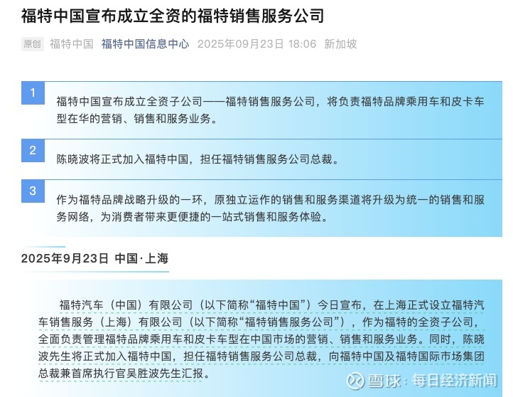 同日晚间,福特中国也宣布在上海正式设立福特汽车销售服务(上海)有限公司,作为福特全资子公司,全面负责管理福特品牌乘用车和皮卡车型在中国市场的营销、销售和服务业务,“预计新公司将于2025年10月1日正式运营”。