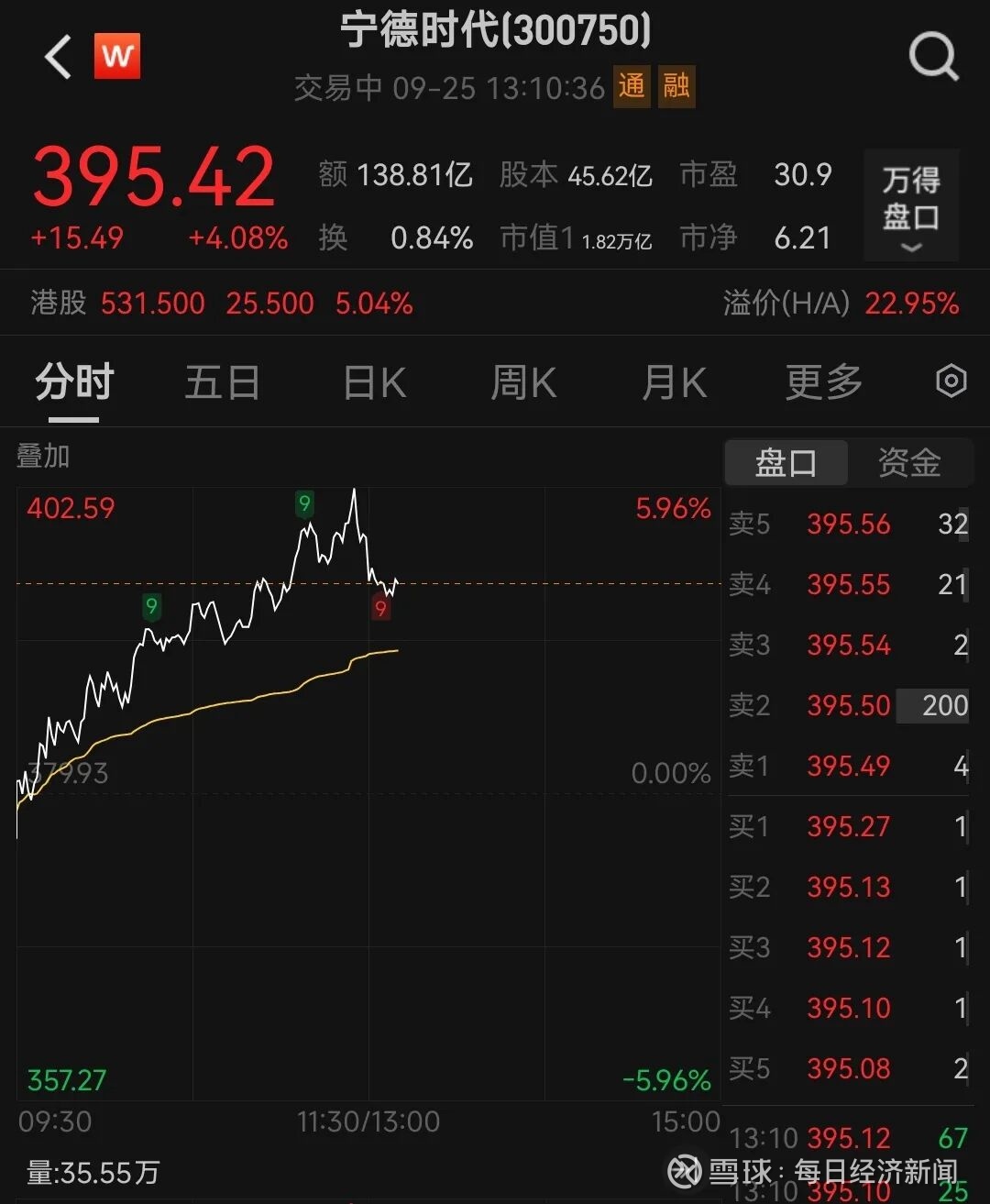9月25日截至发稿,宁德时代A股盘中涨超4%,总市值达1.82万亿元,贵州茅台市值约为1.80万亿元。宁德时代A股市值超越贵州茅台。