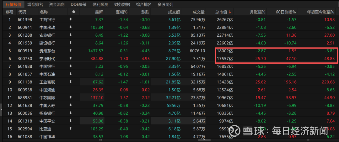 9月25日,贵州茅台股价表现稳定,守住1.80万亿元关口。不过宁德时代开盘后股价涨幅持续扩大,市值从1.75万亿元开始拉升,1.76、1.77、1.78、1.79……最终突破1.80万亿元,市值历史性超越贵州茅台。