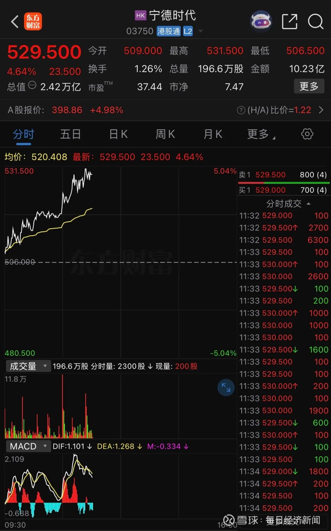 此外,宁德时代H股涨超4%,报529.500港元/股,股价同样创历史新高,且股价自IPO以来翻倍。