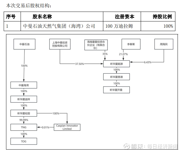 股权结构进一步穿透后可见,中曼石油控股股东上海中曼投资控股有限公司和中曼石油实际控制人李春第合计持有昕华夏能源58.57%的股份。