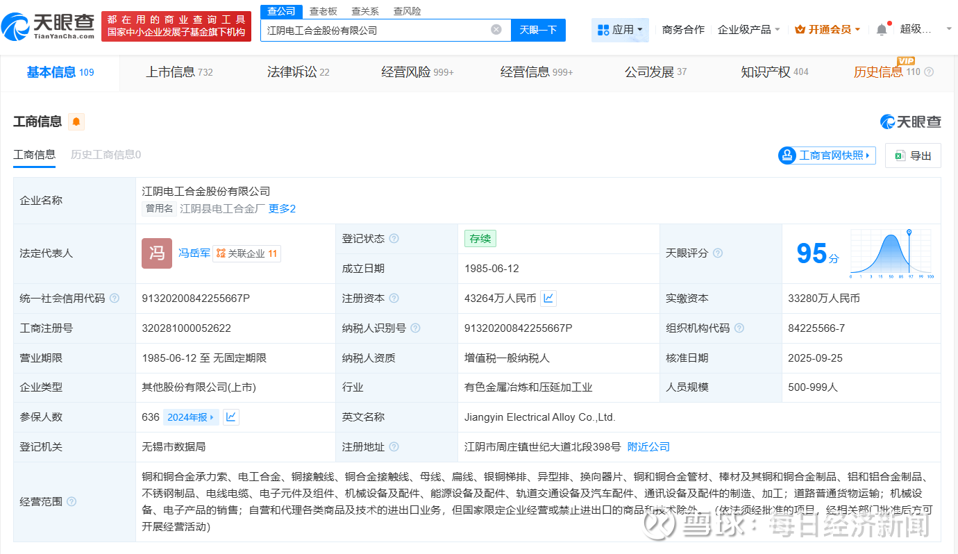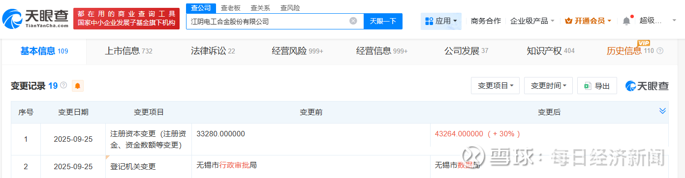 每经AI快讯,天眼查工商信息显示,近日,电工合金(300697)发生工商变更,注册资本由约3.3亿元人民币增至约4.3亿元人民币,增幅30%。江阴电工合金股份有限公司成立于1985年6月,法定代表人为冯岳军,经营范围包括机械设备、电子产品的销售等,由陈力皎、厦门全信企业管理有限公司等共同持股。