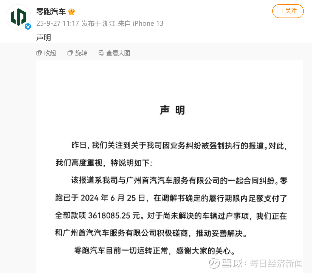 每经AI快讯,9月27日,零跑汽车发布声明称,关注到关于零跑因业务纠纷被强制执行的报道,系零跑与广州首汽汽车服务有限公司的一起合同纠纷。零跑已于2024年6月25日,在调解书确定的履行期限内足额支付了全部款项3618085.25元。对于尚未解决的车辆过户事项,零跑正在和广州首汽汽车服务有限公司积极磋商,推动妥善解决。零跑汽车表示,目前一切运转正常。