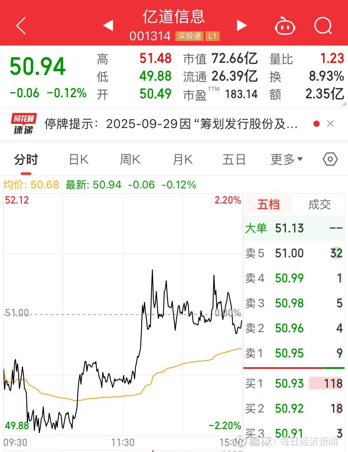 截至9月28日收盘,亿道信息报收于50.94元/股,最新市值为72.66亿元。