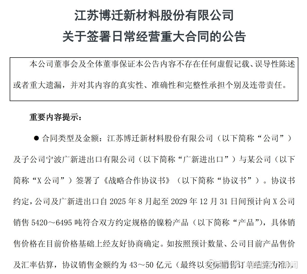 按照协议规定,博迁新材预计从2025年8月起至2029年12月31日期间向X公司销售5420吨至6495吨符合双方约定规格的镍粉产品。如按照预计数量、博迁新材目前产品售价及汇率估算,协议销售金额约为43亿元至50亿元(最终以实际销售订单结算为准)。