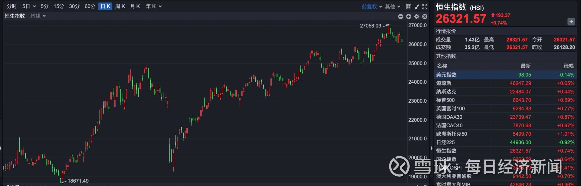 今日(9月29日)港股跳空高开。截至发稿,恒生指数开盘报26321点,上涨193点,涨幅0.74%;恒生科技指数报6236点,上涨41点,涨幅0.67%。