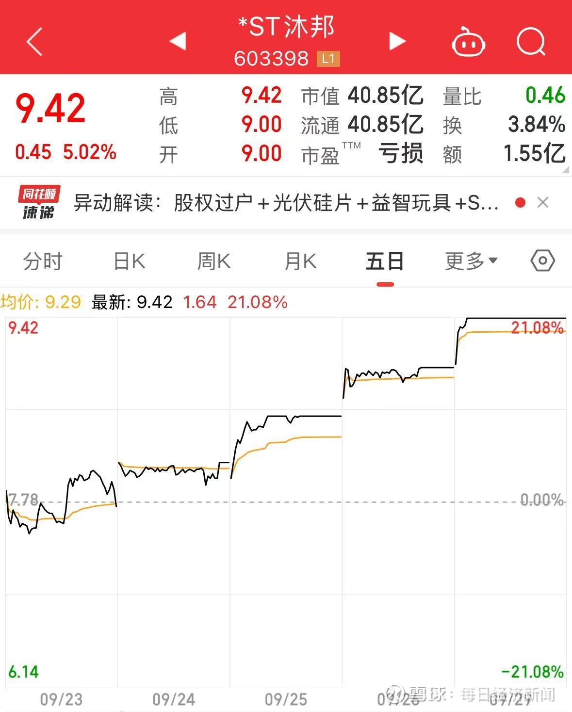 值得注意的是,*ST沐邦近期二级市场走势强劲,已经四连板,9月初至今累计涨幅达51.45%,最新收报9.42元,总市值41亿元。