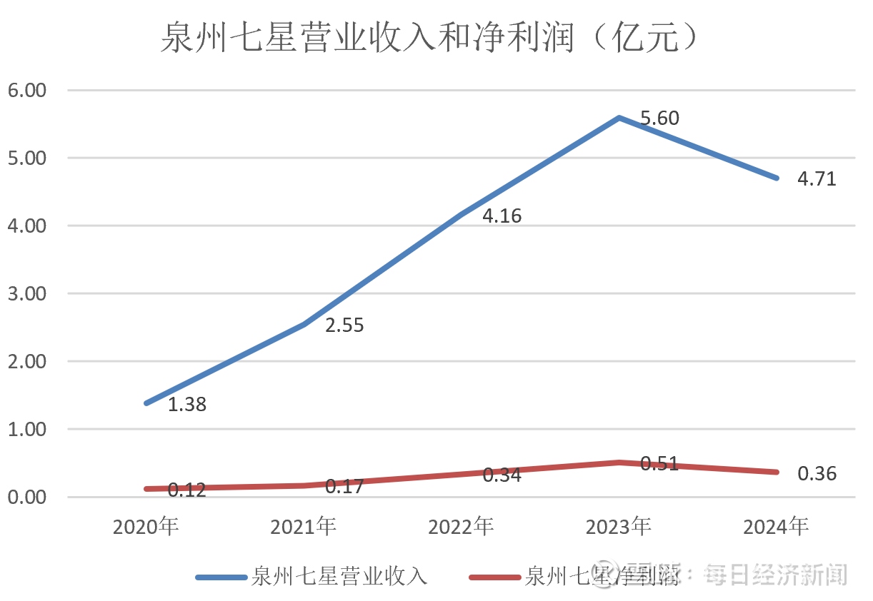 2020年至2024年,泉州七星分别实现营业收入约1.38亿元、2.55亿元、4.16亿元、5.60亿元和4.71亿元,合计约18.4亿元。相应净利润约0.12亿元、0.17亿元、0.34亿元、0.51亿元和0.36亿元,合计约1.5亿元。