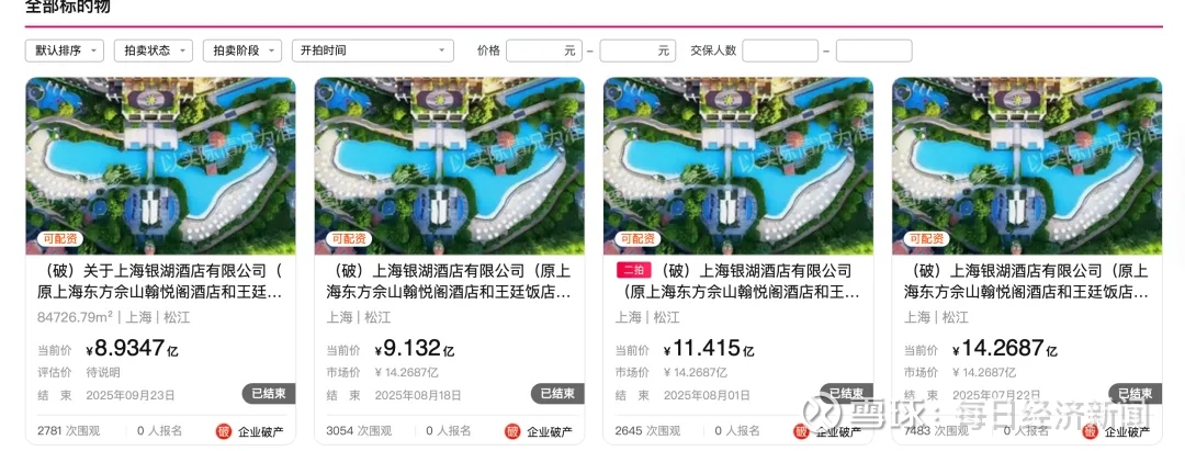 今年7月21日,上海银湖酒店首次上架,彼时起拍价约14.27亿元,吸引了超7000次围观,但一天后流拍。
