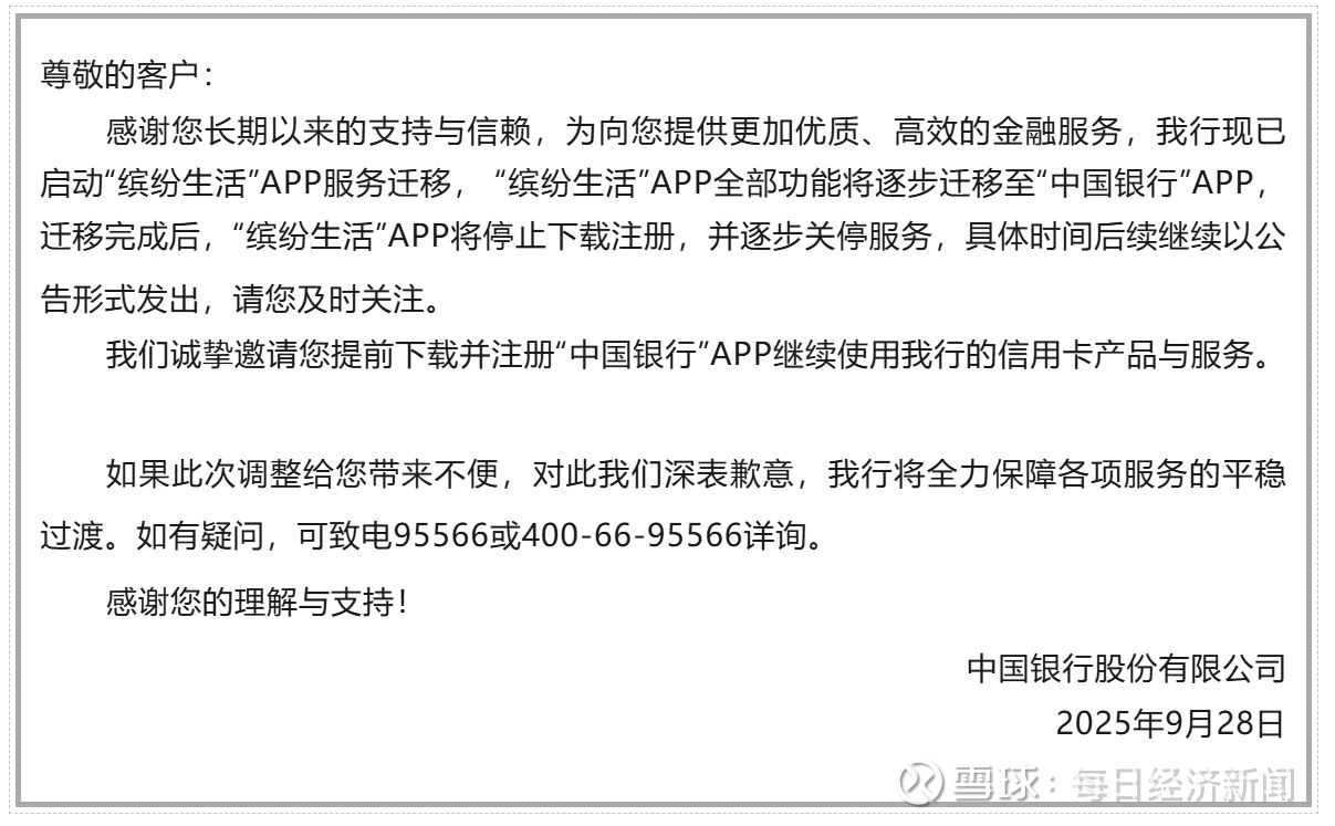 中行将关停“缤纷生活”App9月28日,中国银行公告称,该行已启动“缤纷生活”App服务迁移,“缤纷生活”App全部功能将逐步迁移至“中国银行”App,迁移完成后,“缤纷生活”App将停止下载注册,并逐步关停服务,具体时间后续继续以公告形式发出。