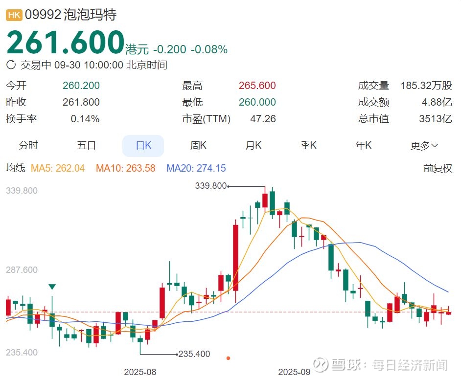 截至9月30日发稿,泡泡玛特(09992.HK)报收261.6港元/股,总市值3513亿港元,近一个月内跌幅达19.3%。