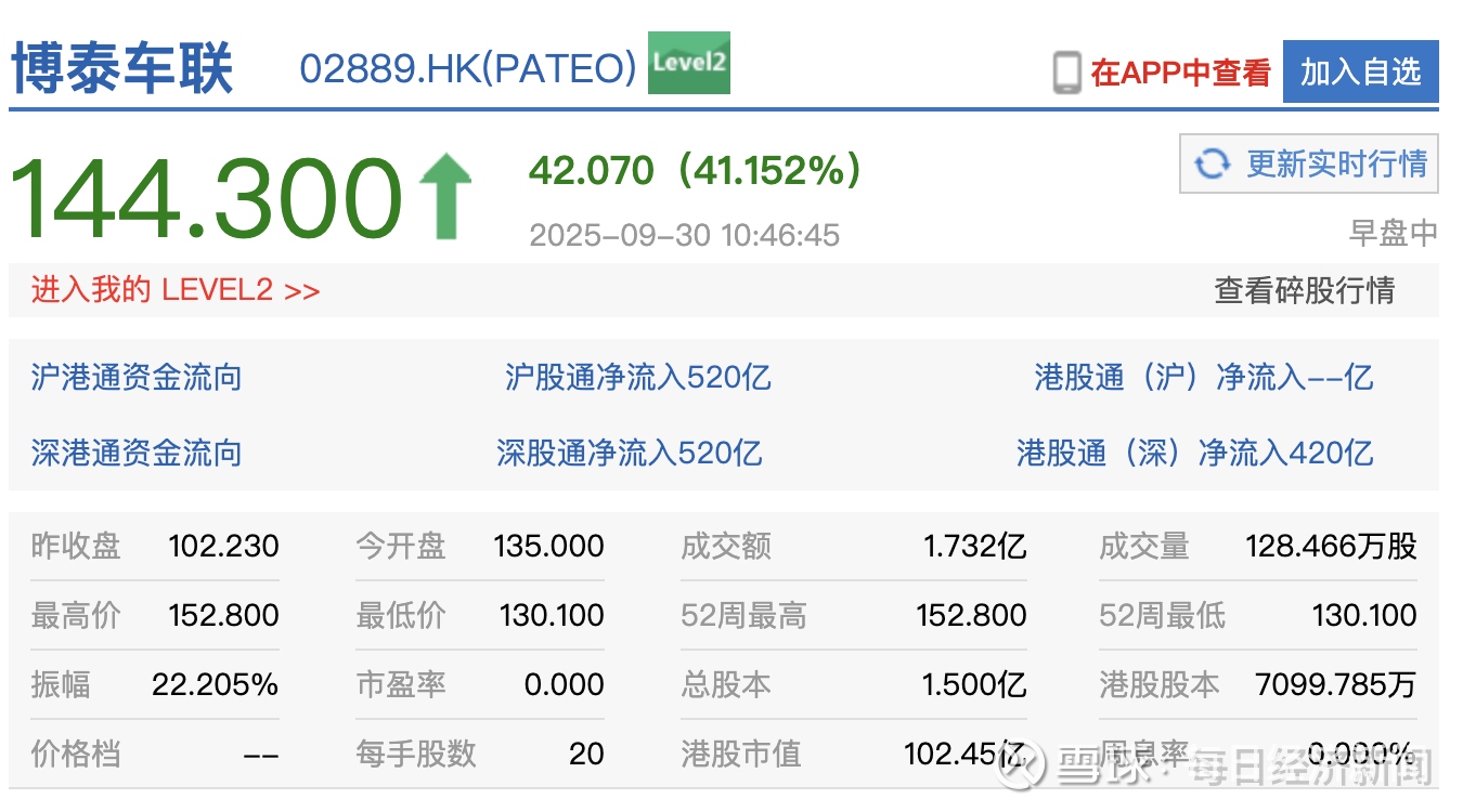 9月30日,博泰车联网科技(上海)股份有限公司(以下简称博泰车联,股票代码:02889.HK)正式在港交所挂牌上市,联席保荐人为中金公司、国泰君安国际、招银国际、华泰国际及中信证券。上市后首个交易日,博泰车联开盘大涨41.15%,截至发稿时,股价144.3港元/股,总市值210.6亿港元。