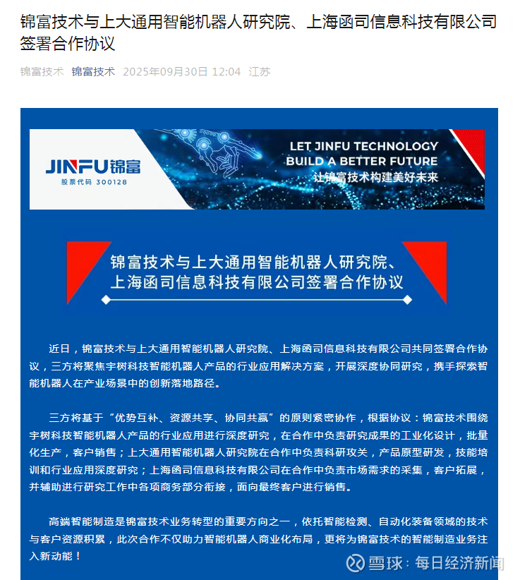 每经AI快讯,近日,锦富技术与上大通用智能机器人研究院、上海函司信息科技有限公司共同签署合作协议,三方将聚焦宇树科技智能机器人产品的行业应用解决方案,开展深度协同研究,携手探索智能机器人在产业场景中的创新落地路径。