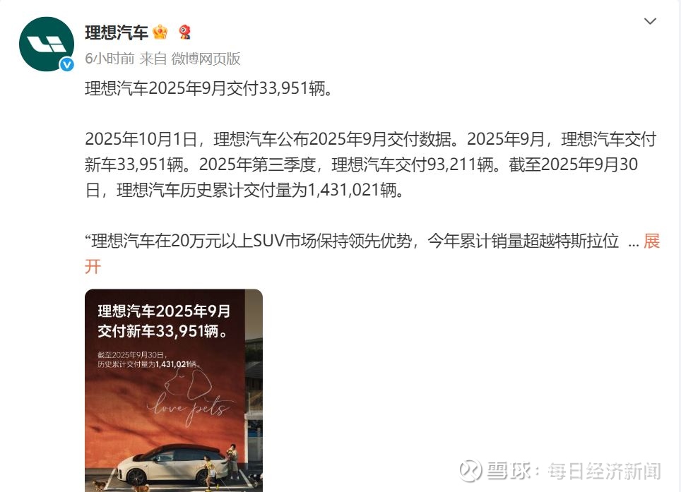 理想汽车公布9月交付数据。2025年9月,理想汽车交付新车33,951辆。2025年第三季度,理想汽车交付93,211辆。截至2025年9月30日,理想汽车历史累计交付量为1,431,021辆。
