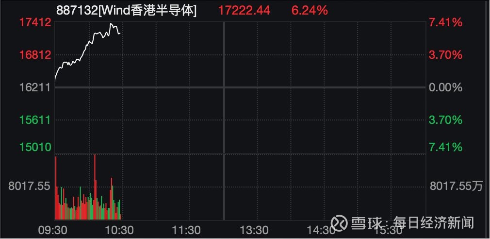 Wind香港半导体指数涨幅超过6%,盘中一度涨超7%。