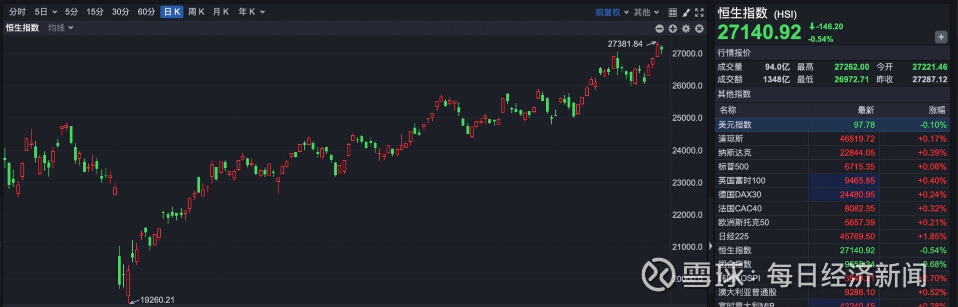 截至收盘,恒生指数报收于27140.92点,下跌146.20点,跌幅0.54%。