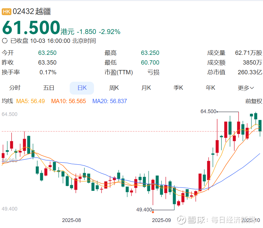 截至10月3日收盘,越疆科技股价报收61.5港元,年内涨幅超159%,总市值260.33亿港元。