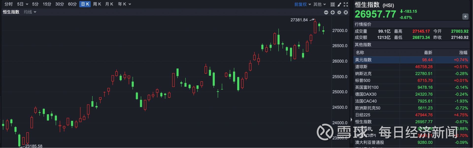 截至收盘,恒生指数报收于26957.77点,下跌183.15点,跌幅0.67%,全天仅成交1213亿港元,较10月3日进一步萎缩。