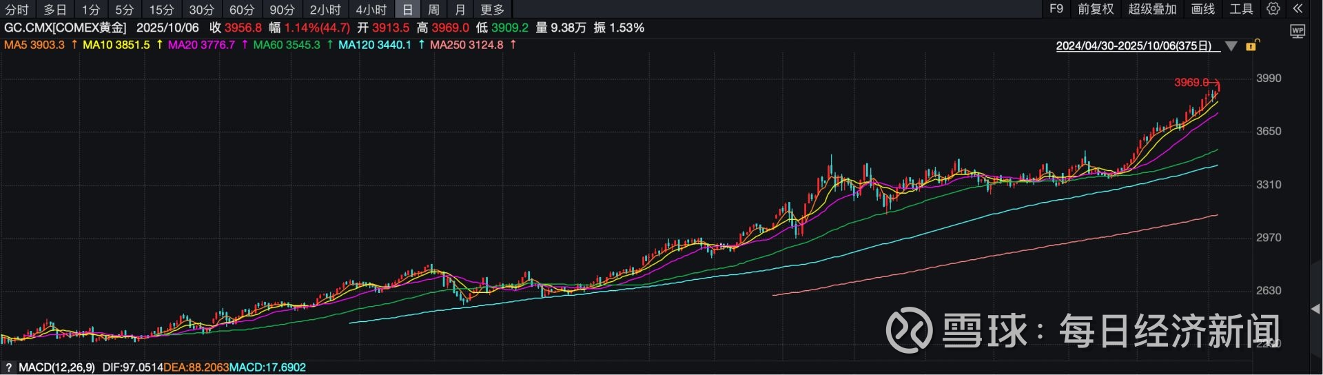 消息面,现货黄金涨超1%,站上3930美元/盎司,再创历史新高。此外,COMEX黄金涨超1%,最高报3969美元/盎司,也创出历史新高。道富投资管理发表每月黄金监测报告指,预计黄金市场在今年第四季或明年初突破4000美元的机率高达75%,今年有望成为自1979年以来黄金回报最强劲的一年。