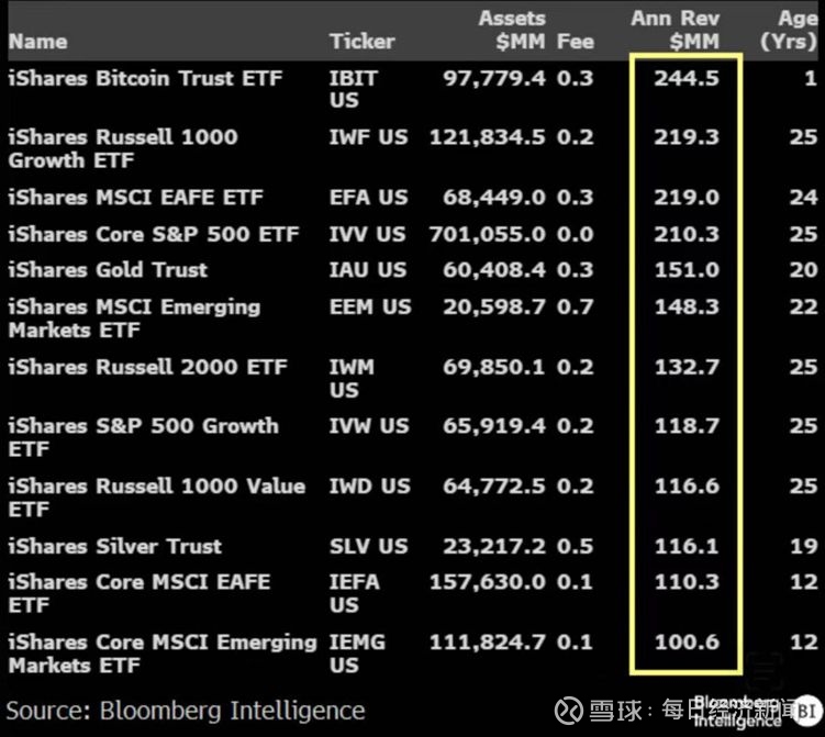 产品资料显示,IBIT的费率为0.25%。而Eric Balchunas提供的数据显示,IBIT一年为贝莱德带来的收入达到2.45亿美元,领先该公司旗下一众成立多年的明星产品。