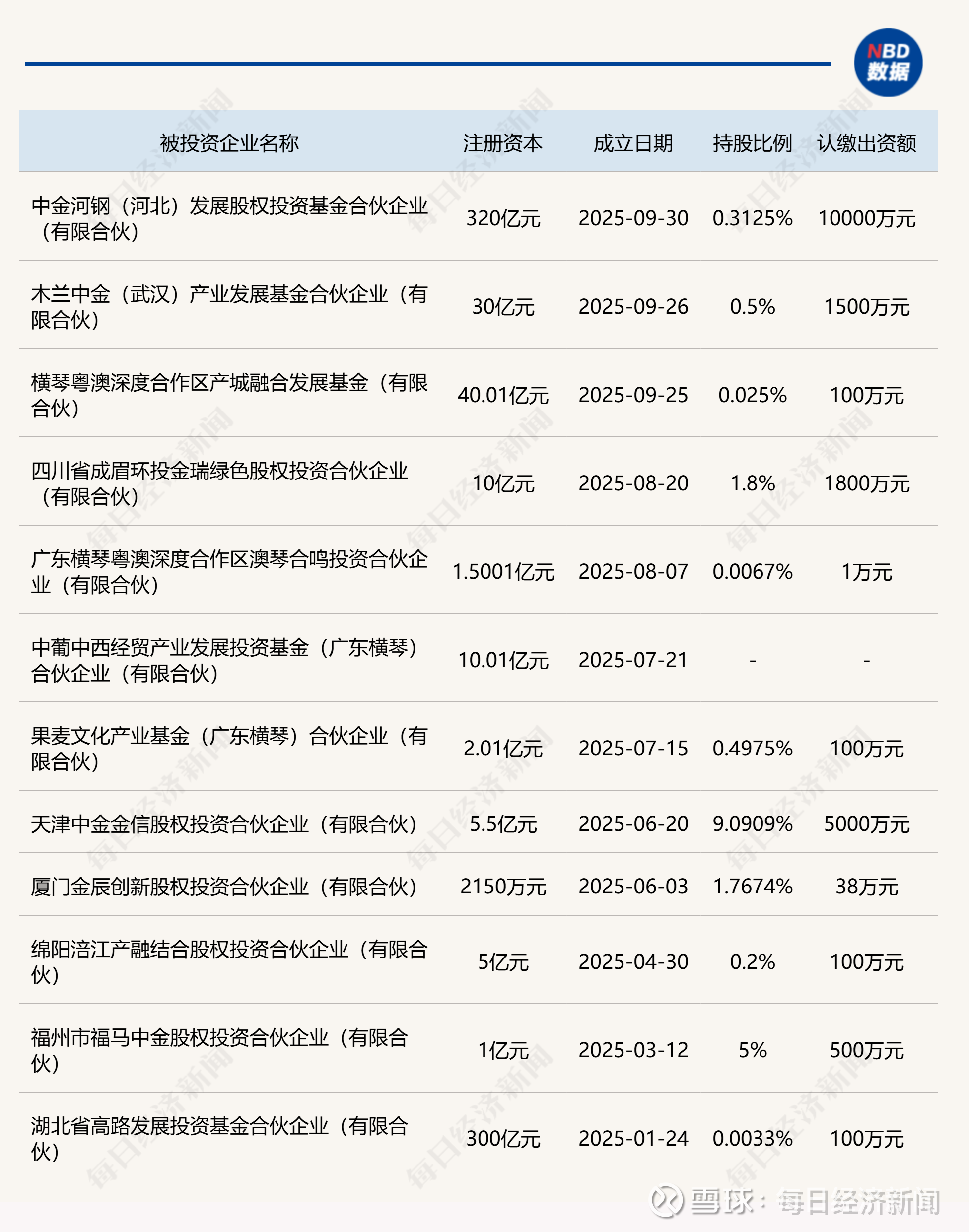 据天眼查,9月30日,中金河钢(河北)发展股权投资基金合伙企业(有限合伙)正式成立。该基金由河钢集团有限公司、中金资本、河钢集团投资控股有限公司共同出资设立,出资额320亿元。其中,河钢集团认缴出资318.99亿元,出资占比99.6844%;中金资本认缴出资1亿元,出资占比0.3125%;河钢集团投资控股有限公司认缴出资100万元,出资占比0.0031%。